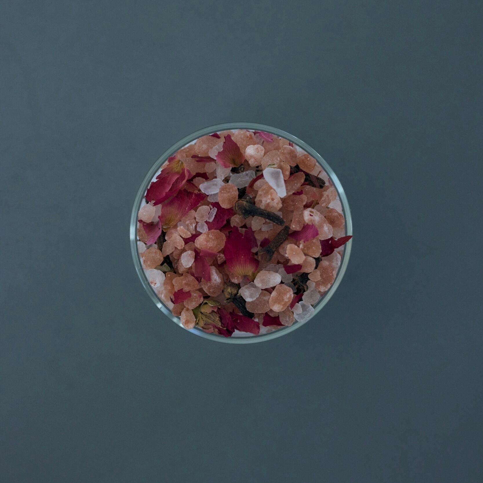 ヒマラヤ岩塩のピンクソルトにダマスクローズとクローブの香りを中心に詰め込みました。